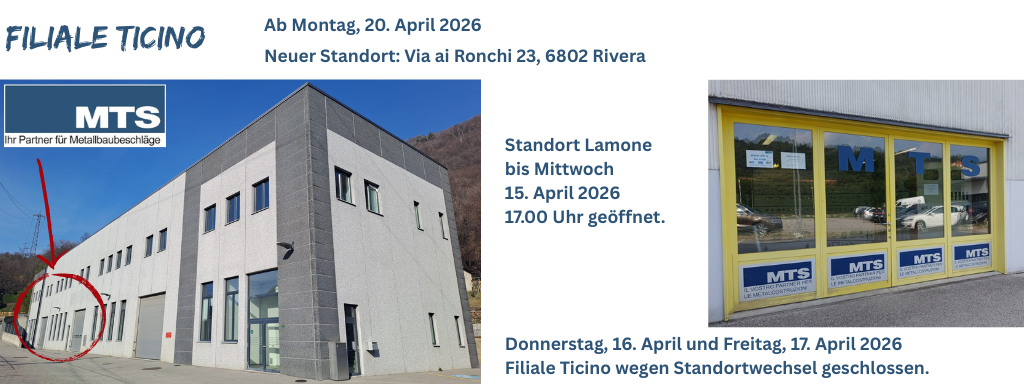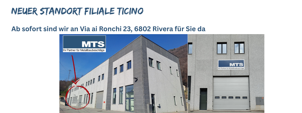 Die MTS Metallbaubeschläge AG ist seit 1968 als Dienstleistungs- und Handelsunternehmen für den Metallbau, Stahlbau, Glasbau und die metallverarbeitende Industrie tätig. Als führender, kompetenter Partner für Beschlagslösungen schaffen wir Mehrwert für unsere Kunden und streben nach kontinuierlicher Optimierung. Unsere Kunden schätzen unsere fachkundige, kompetente Beratung.